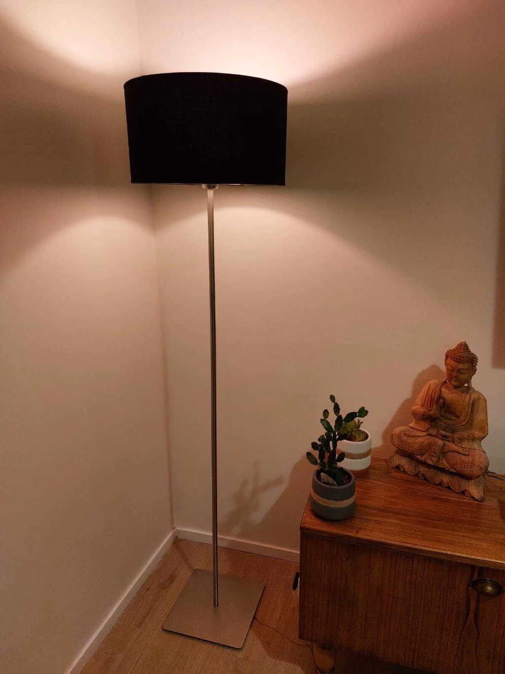 El acero inoxidable, elegido por su resistencia y acabado pulido, proporciona un brillo duradero que eleva la estética de cualquier entorno y garantiza una durabilidad excepcional. La pantalla en la cima actúa como un filtro sutil para la luz que proyecta, creando una iluminación suave y acogedora.