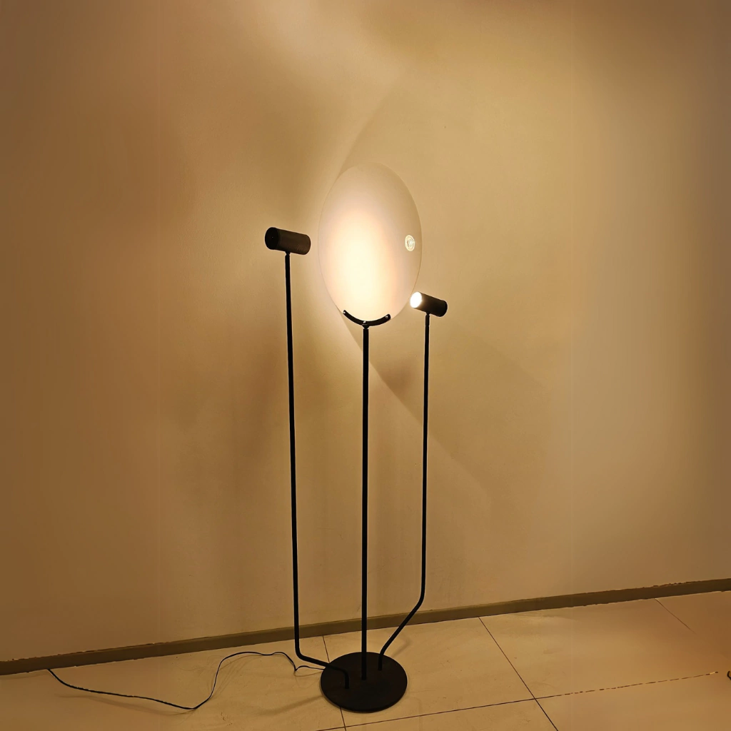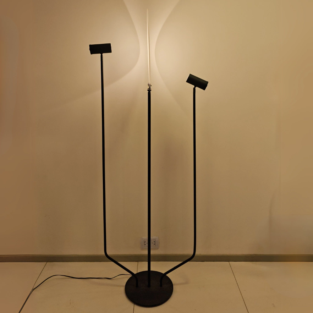 La elegancia y la funcionalidad se combinan en esta lámpara de pie de diseño moderno. Cuenta con dos cabezales direccionales que proyectan luz hacia un disco de acrílico central, creando un efecto luminoso único y sofisticado. Los cabezales se pueden direccionar a otro lugar, sea el techo para reflejar su luz o a una obra de arte para destacarla.