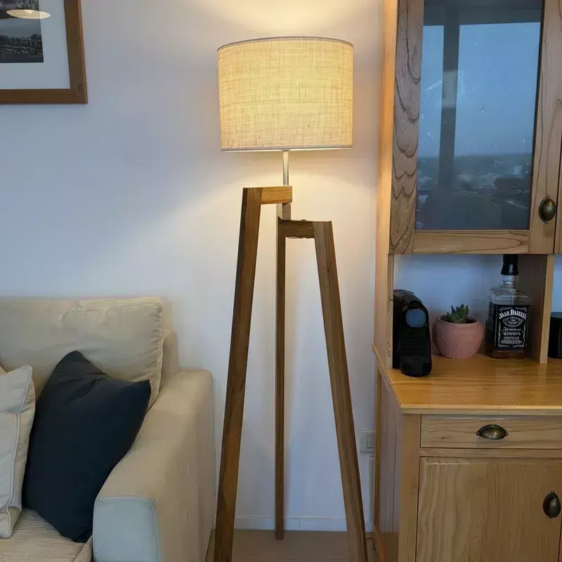 Elegante diseño que combina la calidez de la madera con una estructura trípode única. Su base de madera sólida no solo proporciona estabilidad, sino que también añade un toque de naturaleza a tu hogar y su pantalla difunde la luz de manera uniforme creando así una atmósfera sumamente acogedora.